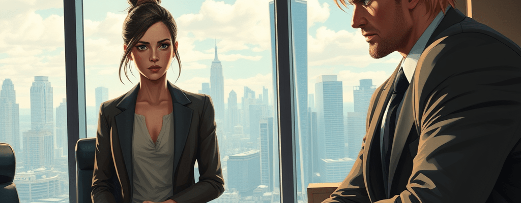 Damien’s office loomed around her like a gilded cage, adorned with floor-to-ceiling windows that offered a breathtaking view of the city skyline. The sleek, modern furniture exuded a polished elegance, and the atmosphere felt charged with the unspoken weight of multi-million-dollar deals being sealed before breakfast